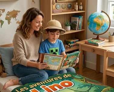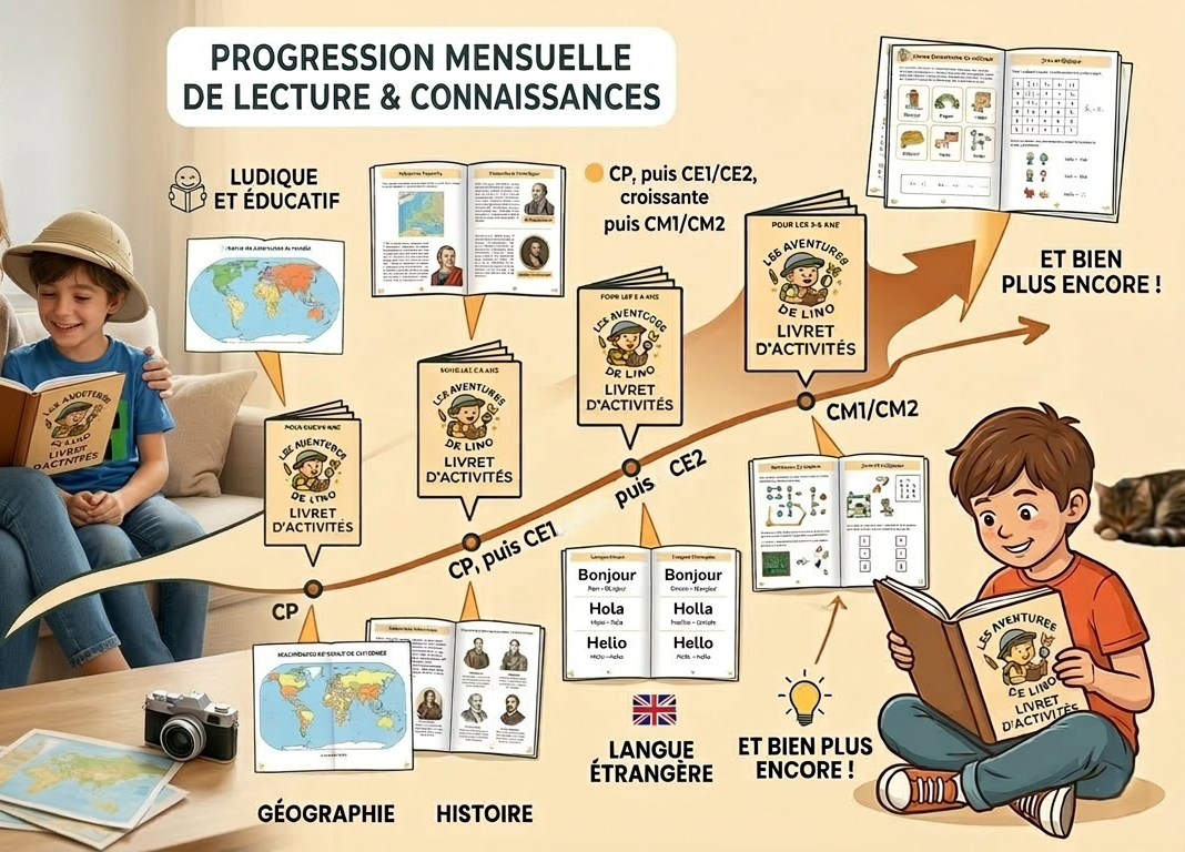 Les chapitres sont pensés pour évoluer progressivement : la lecture et les contenus gagnent en richesse et en complexité au fil des mois, accompagnant naturellement la progression de votre enfant. Ainsi, l’enfant grandit avec l’histoire de Lino, développe sa curiosité et prend confiance dans sa lecture.